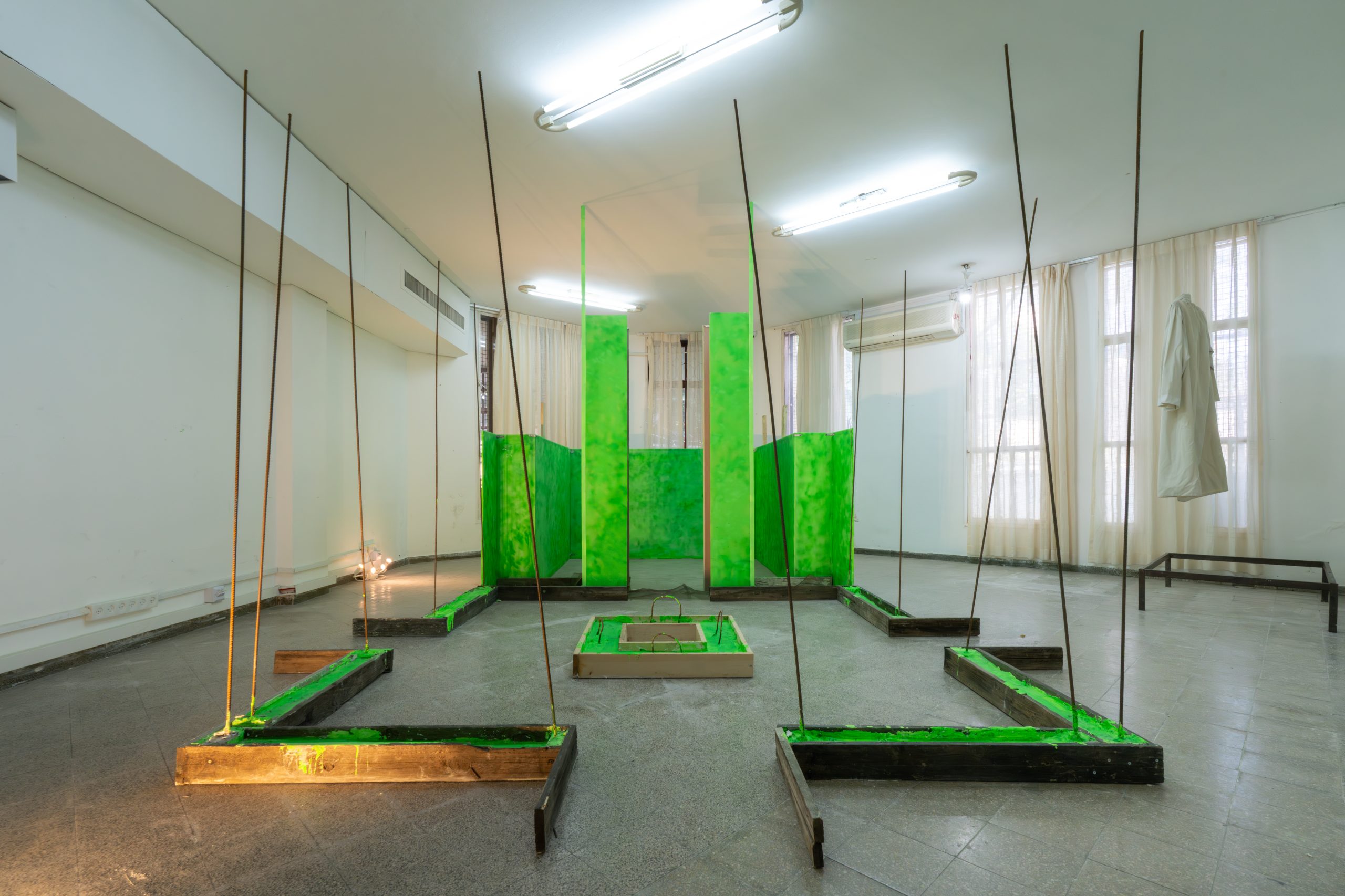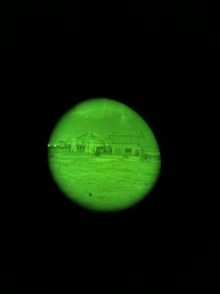 בשדה הקרב בשעות החשכה הלוחמים נדרשים להרכיב מכשיר לראיית לילה המאפשר להם לראות בחושך. כדי לראות את הצמיחה שאנחנו עוברים בתקופה חשוכה זו, גם אני מנסה להרכיב משקפיים כאלה. המבנה שיצרתי בנוי לפי תוכנית הבנייה של בית המקדש השלישי, עשוי מגבס ונתמך בעצים, צבעו הירוק מדמה את המבט הנשקף ממשקפת הלילה.